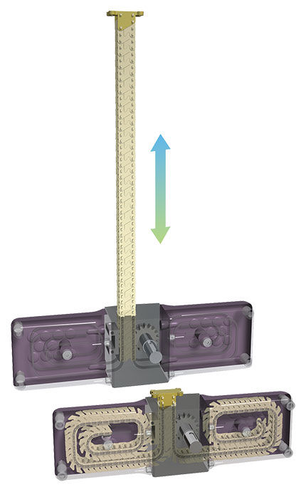 The Tsubaki Zip Chain Actuator is a linear actuator that “zips” together specially segmented chain using a custom designed sprocket. This “zipping” action creates a rigid actuating arm for use in push-pull applications that require high speeds, long lifetimes, small footprints, and/or high precision.
