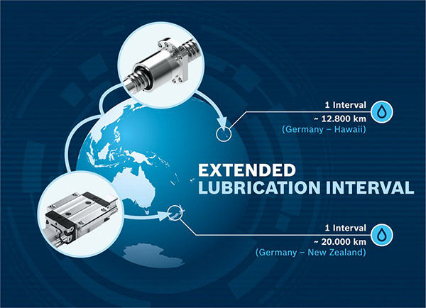 The results of the most recent tests show that the lubrication intervals for Rexroth’s ball rail systems BSHP are twice as long as they were before. The runner blocks can cover up to 20,000 km before the first relubrication, the same distance as from Germany to New Zealand.