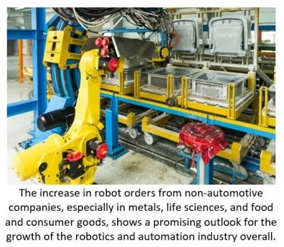 While robotic purchases from automotive manufacturers can be highly cyclical, the increase from non-automotive companies, especially in metals, life sciences, and food and consumer goods, shows a promising outlook for the growth of the robotics and automation industry overall.