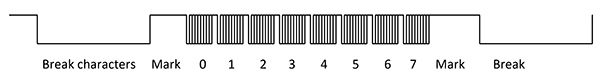 DMX-512: Where lighting and special effects are included, DMX-512 is the standard for digital communication. DMX-512 controllers can control lighting flood orientation, color, intensity, smoke machines, camera location and shutter, focus, and the props and characters, so that these can all be synchronized to the camera. DMX-512 is a well-defined serial stream with a RS-485 hardware format. The most basic format uses a 250k-baud (4uS/bit), 1 start bit, 8 bit data, no parity, 2 stop bit format (44uS per “slot”) with a minimum 2 slot (88uS) break to indicate the starting of a new frame. The first character defines the “universe” (which devices are to respond to the frame) as well as special packets, and the remaining up-to 511 slots carrying data to control the various devices. More advanced versions of DMX-512 allow for diagnostics with the controlled devices being able to respond to special query packets. Multiple slots can be combined to allow 8, 16, 24, and 32 bit data to be represented in the stream; these are normally configured as big-endian (MSB sent first). Each device checks the sent universe (first byte in the frame) addressing that device, and then counts off the bytes to see which bytes or groups are applicable to that device. Some devices include the ability to check the first 100 slots to help avoid corrupted data. Although DMX-512 can convey up to 512 slots, shorter frames are commonly used to allow the frames to be fast enough to allow a frame of data to by synced to one shutter of the camera. Figure 3 shows a short frame, starting with break characters to mark the start of the frame, the mark after frame to let the serial converter settle after the break, and then the slots (8 total in this example). The frame then repeats.