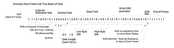 Figure 5 shows a full frame with 2 bytes of data for the basic CAN signals (non-FD). Not shown in the figure is bit-stuffing: all of the units on the bus resynchronize their timing with each transition of the bus to compensate for differences in their internal clock speeds. To prevent too much drift in their relative timing, the protocol does not allow more than 5 bits of the same polarity before a bit of the opposite polarity is inserted (stuffed) into the frame. These extra bits provide the transitions needed to resynchronize timing between units. These extra bits make the frame time slightly longer dependent upon the data present, and are discarded when the frame is received.