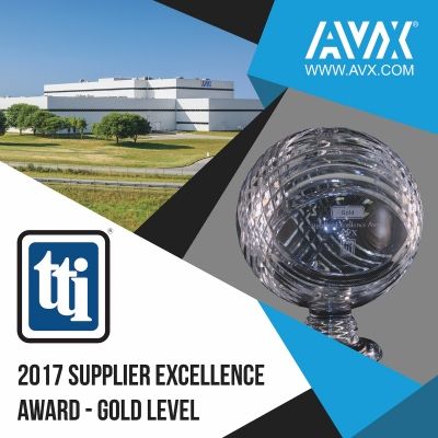 Designed to recognize superior supplier performance with regard to quality acceptance, ship-to-commit delivery date, effective business systems, ease of doing business, and both the quality and efficacy of field employee and management relationships, the 2017 TTI Supplier Excellence Award honors AVX for its superior execution of the following performance metrics: on-time delivery, receiving quality, customer-reported quality, administrative quality, operations and business systems, and sales and management support.
