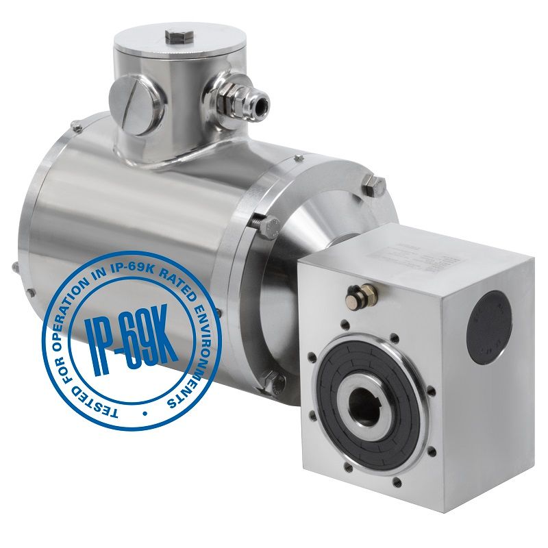 Designed to withstand constant exposure to high-pressure water washdowns, Bodine's new 56R1-50JW/H gearmotors feature high-grade, corrosion resistant stainless-steel housings and are fully watertight. The gearmotor's smooth surface allows thorough and efficient cleaning, reducing the possibility of bacteria growth. The totally enclosed, non-ventilated (TENV) motor prevents airborne re-contamination caused by air movement from a cooling fan. The large, water-tight junction box is in the 12 o'clock position for easy access. The gearmotors meet IP-69K standards.