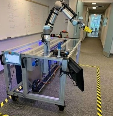 The multi-axis system features the Festo Motion Control Package (FMCP) for UR, which is a complete motion control panel for up to four axis motion. The FMCP is fully integrated with the UR cobot control panel and HMI and features a UR safety I/O and communications interface.
