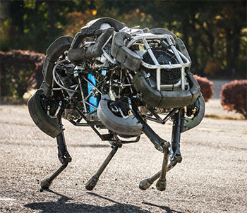 First up—the WildCat Robot from Boston Robotics. It can “run across any type of terrain, since its main purpose is either a cargo-carrying unit or an intelligence-carrying unit.” For example, sand dunes pose no obstacle to this leggy warrior. Always in continuing improvement mode, the WildCat currently travels at about 16-25 mph on flat terrain — using a bounding and galloping gait. Imagine a squad of these guys coming at you with no place to run. While this iteration is not a killing machine, gathering enemy intelligence can lead to dire results for the bad guys.