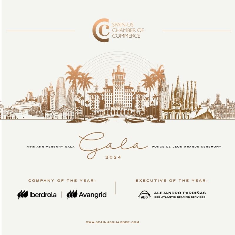 The Spain-US Chamber of Commerce in Florida is proud to announce that the recipients of the 2024 Ponce de León Awards for "Company of the Year" are Iberdrola and its U.S. subsidiary, Avangrid and the "Executive of the Year" is Alejandro Pardiñas, CEO of ABS, recognizing their exceptional contributions to energy innovation and industrial leadership.
