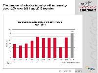 - Depending on the duration of the shortage of components on the world market the expected increase of turnover will partly be shifted from 2011 to 2012. A likely scenario is that the growth rate for 2011 will be less than 15% and that the growth rate for 2012 will be above 5%. The IFR believes that the turnover of robotics industry will increase by about 20% over both years together.
