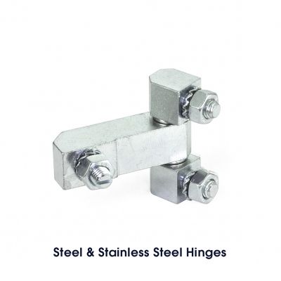 Hinges are available in steel, with a zinc-plated, blue passivated finish, European Standard No. 1.4305 stainless steel (American Standard Series 303), or European standard 1.4408 stainless steel (American Standard Series 316). The steel version has a brass, nickel-plated hinge pin and hinge washer; steel hex nut and serrated washer are zinc-plated, with a blue passivated finish. Both stainless steel versions have all stainless steel parts.