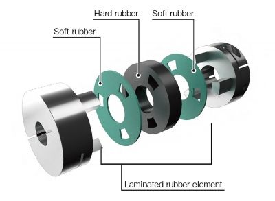 With this design, the hard (black) element is separated from the aluminum alloy hubs by a softer (green) elastomer disc. This combination maintains adequate torsional stiffness for precise positional accuracy while still allowing for minimal angular and parallel misalignment, and absorbing vibration. The power-transmitting element, consisting of different hardness layers, also achieves a reduction in counter force generated by misalignment. This can greatly reduce the load on the bearing – resulting in reduced heat load.