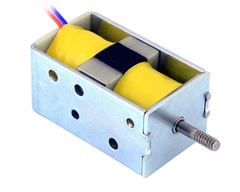 An application will dictate the selection of either an S-18-100LC2 or S-18-100LF2 solenoid. The “C” in the S-18-100LC2 indicates the plunger ends and the mating stops are conical shaped, whereas “F” in the S-18-100LF2 indicates the shape of the plunger ends and stops as flat. The difference is realized when the two coils of the solenoids, connected in parallel, are supplied with 7.5 watts of power. The conical ends and mating stops of the S-18-100LC2 have a lower latching force (1.4 lb.) and a higher push/pull force (0.5 lb.) in comparison to the S-18-100LF2 with its high latching force (5 lb.) and lower push/pull force (0.3 lb.) Typical applications include valve control, office equipment, switch activation, clamping, positioning, games and toys, vending machines, and door locks.