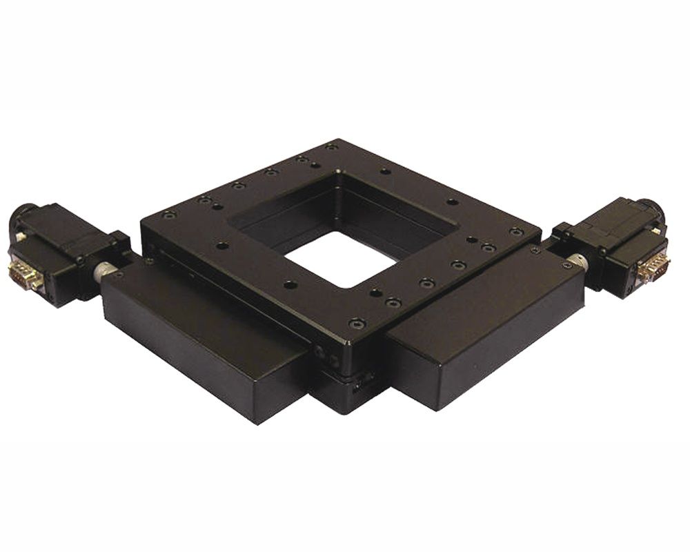 The XY table measures 155 mm x 155 mm and features a precision pattern of drilled and threaded mounting holes to facilitate the addition of tooling or fixtures. This low profile black anodized aluminum XY stage is easy to integrate into new or existing systems. The two-phase stepper motors with knobs for manual adjustments of each axis are standard for the AU200-50x50 open aperture alignment stage, however, the knobs can be replaced with 500 cycles-per-revolution quadrature optical encoders for position verification. Compatible multi-axis motion controllers are also available from OES and the AU200-50x50 open aperture alignment stage can be ordered as a complete plug-and-play system.