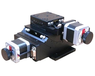 Each axis features a calibrated scale to visually display the angle of rotation. The maximum speed with stepper motors is 14 degrees/second and 45 degrees/second with servomotors. The resolution of the PR100-45-01 stepper motor driven duel-axis stage depends on the resolution of the stepper motor driver resolution or the optical encoder if a servomotor is used. A resolution of 0.001 degrees equivalent to 3.6 arc-sec can be achieved using a 10 micro-steps per step stepper motor driver or an encoder with a resolution of 500 cycles per revolution.
