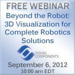 3-D Simulation is an imperative solution tool to validate and verify any manufacturing concept or process. As CAD is to Product Design and Development, 3-D Graphical Simulation is to the "How and with what to build it" in the manufacturing and production life of the product which includes robotic off-line programming, material/factory flow, resource/process planning and PLC validation for controls logic. On September 6th, Visual Components is presenting a webinar at 10:00 a.m. EDT called, "Beyond the Robot: 3-D Visualization for Complete Robotic Solutions." Attendees will learn to develop high end factory simulations from sales to power users; dispel the perception that 3-D Simulations is difficult to use, requires special skills and is costly; access an all-inclusive library of over 1,000 components including all industrial robot models; use all functions/features that are resident on one product, on one platform for all manufacturing disciplines and much more. To register, visit the website below:
