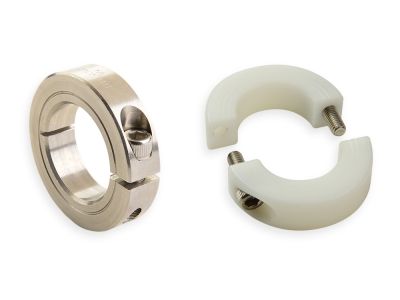 Clamp style shaft collars do not mar the shaft, have high holding power, and allow for simple positioning adjustments. They distribute compressive forces evenly around the shaft for a tight fit and improved holding power when compared to set screw collars. Two-piece styles offer in-place installation and disassembly, increased holding power, and are mated throughout the manufacturing to ensure proper fit and alignment. The Ruland name and bore size are stamped on every shaft collar for ease of identification.