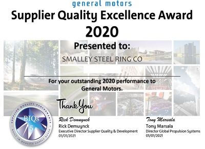 Smalley received the 2020 General Motors Supplier Quality Excellence Award for the 9th consecutive year. Out of the thousands of GM suppliers, only a small percentage receive this prestigious honor. The Supplier Quality Excellence Award is presented to suppliers who have met or exceeded a stringent set of criteria ranging from production to delivery.
