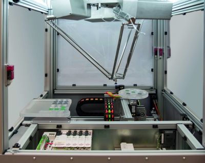 All robot axes are driven by Lexium motors, controlled by PacDrive 3 servo drives from the Lexium 62 multi-axis servo solution. The entire demo machine is controlled by a PacDrive LMC 600 controller, which communicates with the servo drives via the Sercos automation bus.