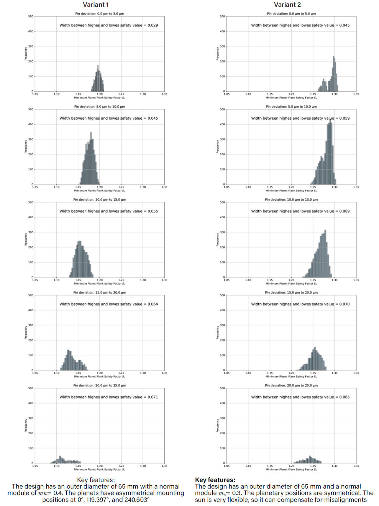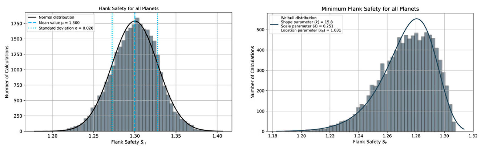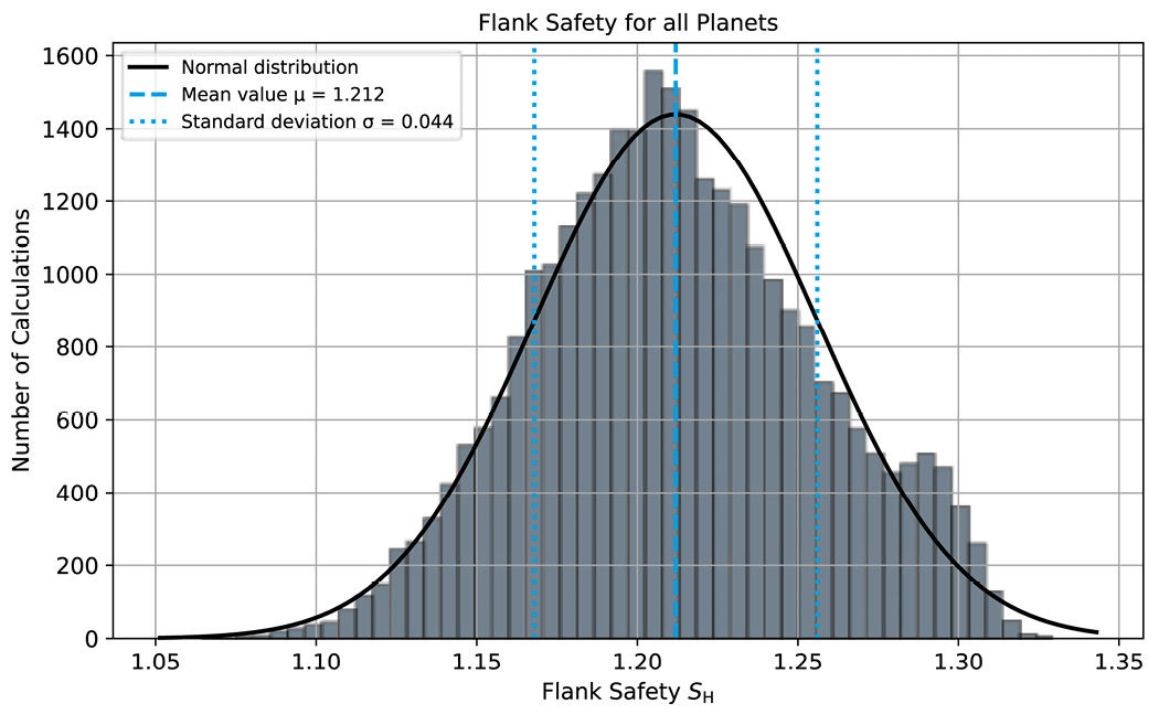 As in the previous model, this gearbox was designed for flank safety in the sun-planet mesh with a nominal safety of 1.2. Figure 10 shows the histograms of the calculations, with the minimum safety factors on the right and all planetary safety factors on the left. Overall, the safety factors for this model are slightly higher than in the previous model. This is because the design calculation is based on the conservative assumption that the highest load-sharing factor Kγ and the highest width load factor KHΒ occur on one planet.