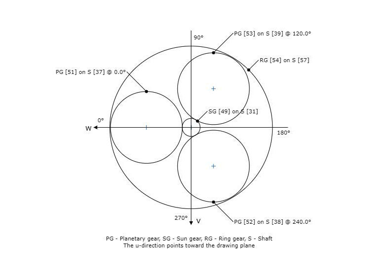 The sun is very mobile in this design, and the thin design makes it possible for the sun gear to compensate for planetary displacements. The mobility is due to the arrangement of the planets being symmetrical. The designation of the planets and the angular arrangement are shown in Figure 9.