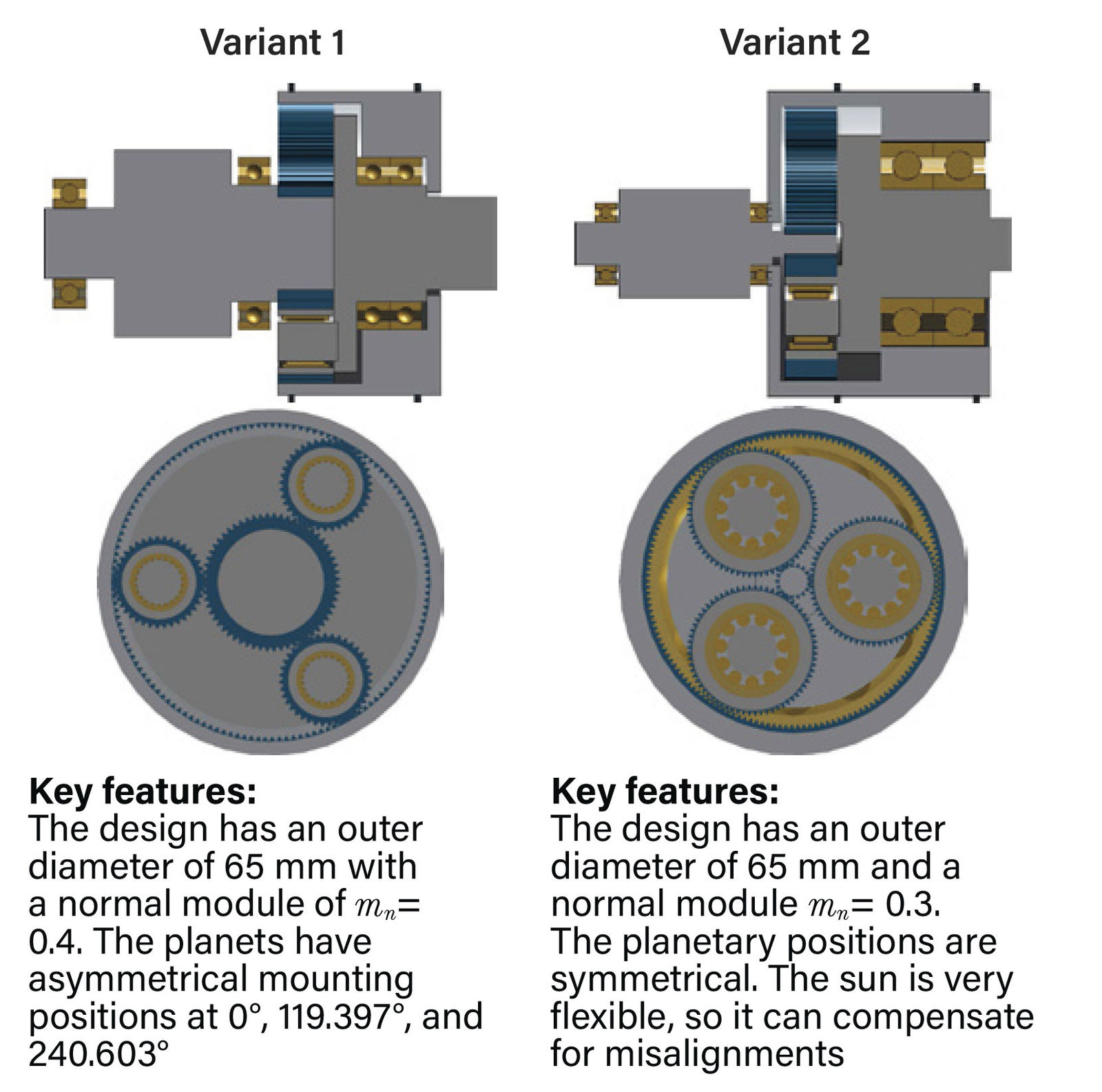 Variant 1 is driven by the sun with 20 Nm at 5000 rpm, with a transmission ratio of i=3.3. This results in a pitting safety of SH = 1.22 and a tooth root safety of SF= 1.77 for the sun-planet mesh according to ISO 6336. These safety factors have been determined using the highest face load factor KHΒ and the worst load-sharing factor Kγ. The planet-ring gear mesh has a flank safety of SH= 2.4; however, this is not critical and is not considered further below.
