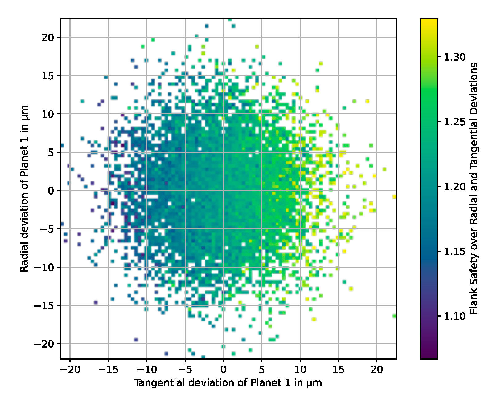 What is notable in Figure 6 and all the following diagrams is that there is no continuous color gradient, meaning that individual fields of low safety can appear in areas with higher safety factors. This is because all of the planets were varied, and the safety is determined based on the position of all planets and the resulting load sharing. This effect was reduced by averaging the values in fields with more than one calculation.