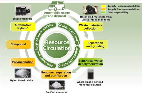 The Ministry of the Environment adopted this technology for a fiscal 2023 project to establish a decarbonized circular economy system, including to validate recycling systems for plastics and other resources. Toray and Honda look to employ that project to set up a pilot facility with a processing capacity of 500 metric tons annually of raw resin, conducting validation testing with it.