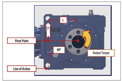A way to minimize this force is to increase the distance L of the pivot point, as shown in Figures 5 and 6. In these examples, the reducer has a T-type torque arm mounted to it, which moves the pivot point an additional 1.85 inches farther from the center of the reducer’s bore.