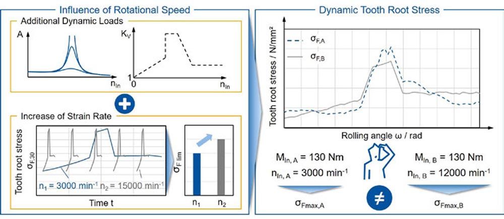 Summarized, it can be stated that with the help of today’s MBSs, the additional dynamic loads in operation can be quantified in detail as a function of the rotational speed. Depending on the selected discretization of the drivetrain, either the calculation of the maximum additional dynamic load or the progression of the additional dynamic load over a gear mesh is possible. Furthermore, it is also possible to consider the influence of modifications and deviations of the gear. Determining the course of the additional dynamic load over a complete tooth mesh enables the additional load to be converted into a dynamic tooth root stress. This has not been done before. With the aid of a validated method for calculating the dynamic tooth root stress, it is possible to take the influence of the dynamics directly into account when calculating the tooth root stress.